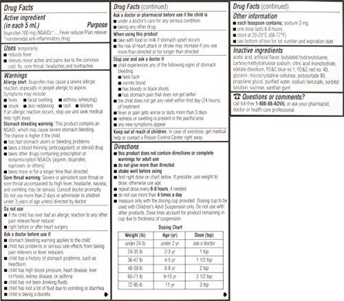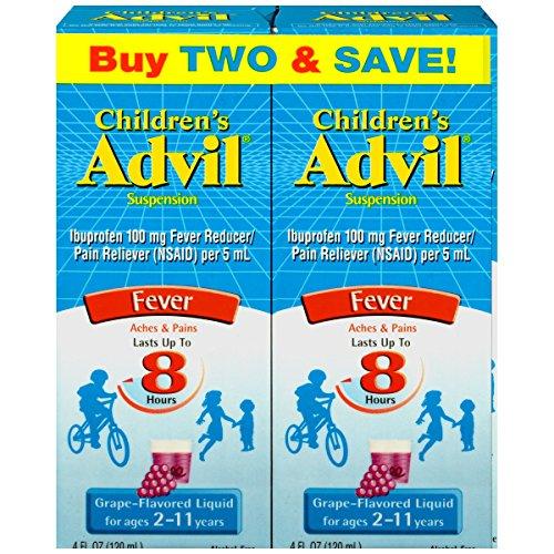 Details: When fever is running through your house, turn to Children's Advil Suspension to reduce fever fast*. Up to 8 hours of relief with just one dose for children aged 2-11. Available in 6 great-tasting flavors: Sugar-free Dye-free Berry, Bubble Gum, Grape, Blue Raspberry, Fruit, and Dye-free White Grape