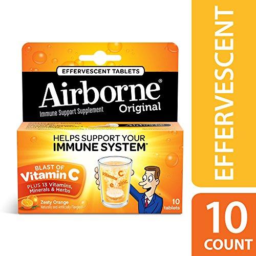 Details: Airborne Effervescent Tablets provide real immune support in a great-tasting and fast absorbing formula. Each serving (1 tablet) delivers a blast of 1000 mg of Vitamin C plus 13 other immune system supporting vitamins, minerals, and herbs, including Echinacea, ginger, and other herbal extracts from whole plant materials.* Adults and Children over 12 years old, simply drop 1 tablet in a glass of water or favorite beverage, let dissolve (about 1 minute) and drink. Can repeat every 3-4 hours as necessary. Take up to 3X per day as needed. Gluten Free and No Preservatives. *These Statements have not been evaluated by the Food and Drug Administration. This product is not intended to diagnose, treat, cure or prevent any disease.
