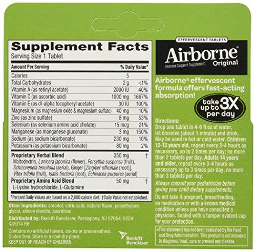 Details: Airborne Effervescent Tablets provide real immune support in a great-tasting and fast absorbing formula. Each serving (1 tablet) delivers a blast of 1000 mg of Vitamin C plus 13 other immune system supporting vitamins, minerals, and herbs, including Echinacea, ginger, and other herbal extracts from whole plant materials.* Adults and Children over 12 years old, simply drop 1 tablet in a glass of water or favorite beverage, let dissolve (about 1 minute) and drink. Can repeat every 3-4 hours as necessary. Take up to 3X per day as needed. Gluten Free and No Preservatives. Visit AirborneHealth.com to learn more. *These Statements have not been evaluated by the Food and Drug Administration. This product is not intended to diagnose, treat, cure or prevent any disease.