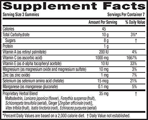 Details: Airborne Immune Support Gummies supplements provide real immune support in a delicious, and easy-to-take gummy form. Each serving (3 gummies) delivers a blast of 1000 mg of Vitamin C plus 9 other immune system supporting vitamins, minerals, and herbs, including Echinacea, ginger, and other herbal extracts from whole plant materials.* Adults and Children 14 years and older, chew 3 gummies thoroughly before swallowing. Repeat as necessary up to 3X per day, no more than 9 gummies per day. *These Statements have not been evaluated by the Food and Drug Administration. This product is not intended to diagnose, treat, cure or prevent any disease.