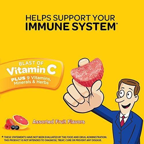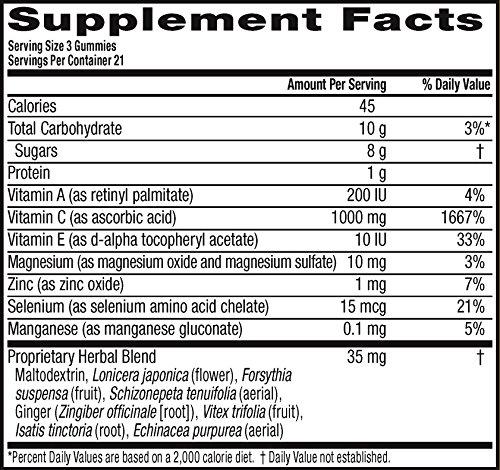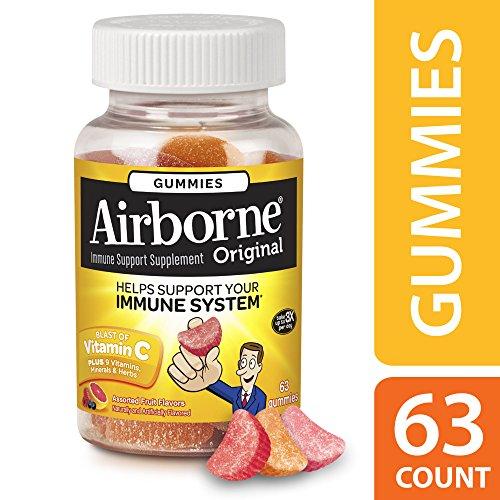 Details: Airborne Immune Support Gummies supplements provide real immune support in a delicious, and easy-to-take gummy form. Each serving (3 gummies) delivers a blast of 1000 mg of Vitamin C plus 9 other immune system supporting vitamins, minerals, and herbs, including Echinacea, ginger, and other herbal extracts from whole plant materials.* Adults and Children 14 years and older, chew 3 gummies thoroughly before swallowing. Repeat as necessary up to 3X per day, no more than 9 gummies per day. *These Statements have not been evaluated by the Food and Drug Administration. This product is not intended to diagnose, treat, cure or prevent any disease.