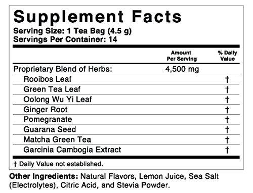 Delicious blend of traditional organic herbs. Blended with Rooibos Leaf, Green Tea Leaf, Oolong Wu Yi Leaf, Ginger Root, Pomegranate, Guarana Seed, Matcha Green Tea, Garcinia Cambogia Extract, Natural Flavors, Lemon Juice, Sea Salt (Electrolytes), Citric Acid, and Stevia Powder.