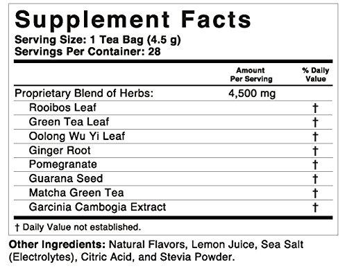Delicious blend of traditional organic herbs. Blended with Rooibos Leaf, Green Tea Leaf, Oolong Wu Yi Leaf, Ginger Root, Pomegranate, Guarana Seed, Matcha Green Tea, Garcinia Cambogia Extract, Natural Flavors, Lemon Juice, Sea Salt (Electrolytes), Citric Acid, and Stevia Powder.