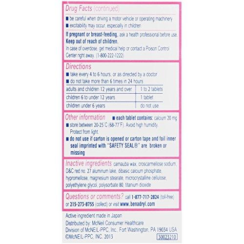 Details: Benadryl Allergy UltraTabs Tablets offer effective relief from upper respiratory allergy and common cold symptoms in a small tablet size. Each tablet contains 25 milligrams of the antihistamine diphenhydramine HCI to temporarily relieve allergy symptoms like sneezing, runny nose, itchy throat and nose, and itchy, watery eyes and the common cold symptoms of runny nose and sneezing. Benadryl Allergy UltraTabs Tablets are intended for adults and children ages six and up.