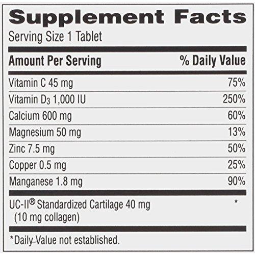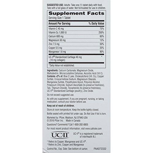 Details: Caltrate Bone & Joint Health is an easy way to help maintain strong bones and flexible joints all in one tablet per day. Get the bone health benefits of calcium, vitamin D3 and magnesium, plus UC-II collagen, vitamin C, and zinc to support joint health. Benefit from 3-in-1 Triple Action: UC-II supports healthy cartilage, promoting joint flexibility and health; calcium and vitamin D3 nourish strong, healthy bones and extra minerals promote bone flexibility. These statements have not been evaluated by the Food and Drug Administration. These products are not intended to diagnose, treat, cure or prevent any disease. Refers to Zinc, Copper, and Manganese. ++Caltrate is the #1 selling brand of calcium supplements.