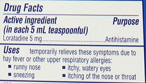 Details: Non-Drowsy (When taken as directed.) Loratadine Oral Solution 5 mg/5 ml-Antihistamine. 24 Hour Relief of: Sneezing; Runny nose; Itchy; Watery eyes; Itchy throat or nose.