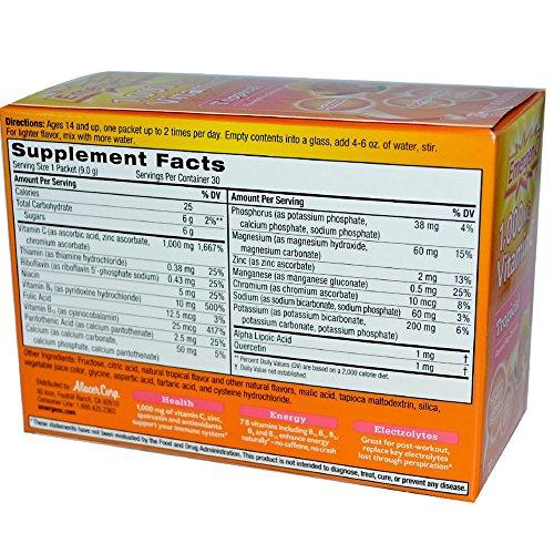 Details: Super Energy Booster. An Incredible Energy Booster: 1000 mg of Vitamin C as seven mineral ascorbates; 32 Active mineral complexes and B vitamins; A powerful antioxidant; Electrolyte balanced; Just add water. Fits in a shirt pocket or purse. The single cell is the unit of life and each of our bodies is composed of some 70 trillion of these tiny factories. So, if we can take care of them, they will take care of us. Yet the major mineral activator within the cells is potassium (K), present in healthy cells at levels 20 times those of sodium. So when you add water to the Emer'gen-C powder, it immediately effervesces to a powerful, delicious, and healthful activator of your metabolic functions, with the astounding benefit of 1000 mg of seven mineral ascorbates, plus the B vitamins. Vitamin C is essential for the formation and maintenance of connective tissue, is a powerful antioxidant, and it is involved in normal immune function. (These statements have not been evaluated by the Food and Drug Administration. This product is not intended to diagnose, treat, cure or prevent any disease.) Made in USA.