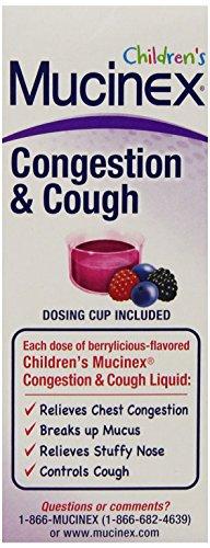 Details: Children's Mucinex Multi-Symptom Cold Liquid helps relieve your child's stuffy nose and cough and breaks up and loosens the mucus that causes chest congestion. Children's Mucinex Multi-Symptom Cold Liquid is available in a great-tasting berry flavor. It has a non-drowsy formula and comes in a convenient liquid form.