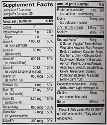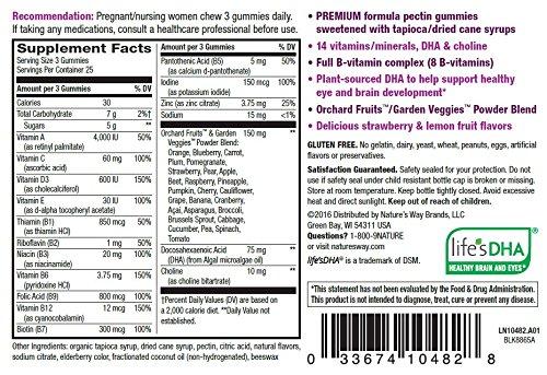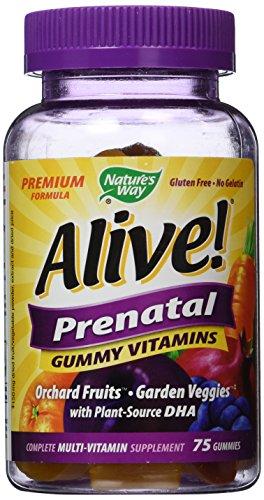 Details: Alive prenatal gummy vitamins by nature's way 75 gummy alive prenatal gummy vitamins 75 gummy strawberry lemon fruit flavors complete multivitamin orchard fruits garden veggies blend (150 mg dried fruit vegetable powder extract and dried juice) with plant-source DHA full b-vitamin complex (8 b-vitamins) supplement facts amount per serving daily value calories 30 total carbohydrates 7g 2 sugars 5 g Vitamin A (as retinyl palmitate) 4 000iu 50 Vitamin C (ascorbic acid) 60 mg 100 vitamin d3 (as cholecalciferol) 600 iu 150 vitamin e (as d-alpha tocopheryl acetate) 30 iu 100 thiamin (b1) (as thiamin hcl) 850 mg 50 riboflavin (b2) 1 mg 50 niacin (b3) (as niacinamide) 20 mg 100 vitamin b6 (pyridoxine hcl) 3.75 mg 150 folic acid (b9) 800 mcg 100 vitamin b12 (as cyanocobalamin) 12 mg 150 biotin (b7) 300 mg 100 pantothenic acid (b5) (as calcium d-pantothenate) 5 mg 505 iodine (as potassium iodide) 150 mcg 100 zinc (as zinc citrate) 3.75 mg 25 sodium 20 mg 1 orchard fruits garden veggies blend (.