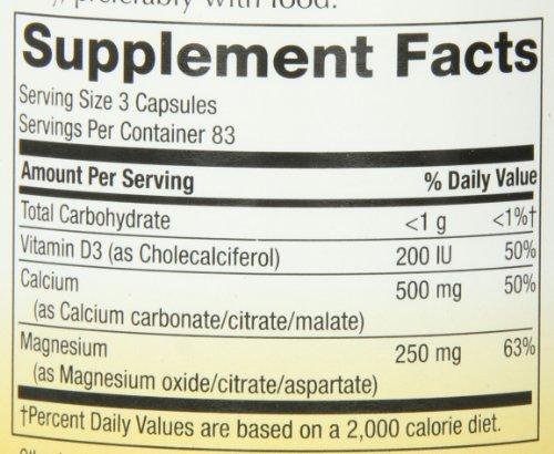 Amount Per Serving% Daily Value***Vitamin D3 (as Cholecalciferol)200 IU50%Calcium (as Calcium carbonate/citrate/malate)500 mg50%Magnesium (as Magnesium oxide/citrate/aspartate)250 mg63%