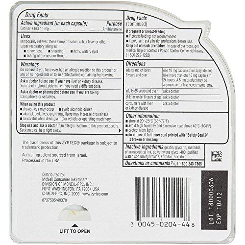 Details: Zyrtec Allergy Liquid Gels provide 24 Hour relief of your worst indoor and outdoor allergy symptoms. With 10 milligrams of cetirizine hydrochloride per capsule, this prescription-strength allergy medicine provides 24 hours of relief from common symptoms of hay fever and other upper respiratory allergies: runny nose, sneezing, itchy and watery eyes, and itching of the nose or throat. Zyrtec is the number-one allergist-recommended brand among OTC oral antihistamines. It is effective in treating indoor allergies from dust, mold, and pet dander, and outdoor, seasonal allergies from tree pollen, weeds, and grasses. Zyrtec is indicated for use by adults and children six years and older; one dose starts working at hour 1 and keeps on working for a full 24 hours.